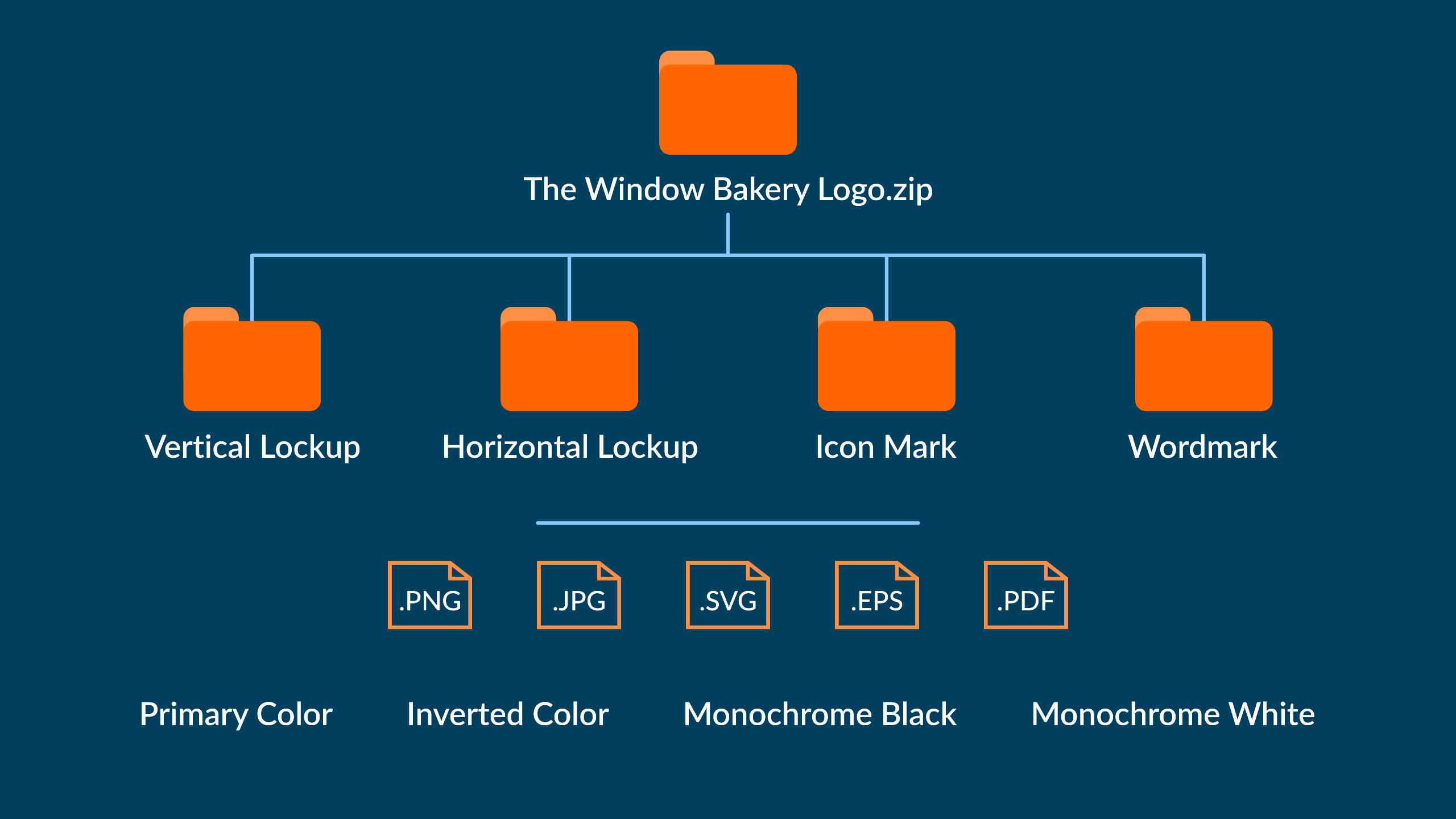 Logo File PackageWhen a logo is finished, I provide a file package that includes: .PNG, .JPG, .SVG, and .EPS files. I give my clients the full lockup, icon, and wordmark files in color, inverted color, black, and white. In the package, clients will receive a file guide explaining each file type and how to use them.